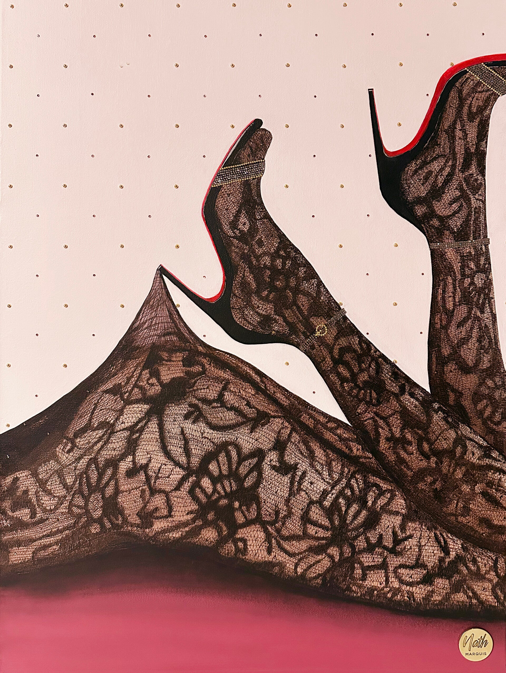 Une silhouette féminine s’étire avec assurance, gainée de dentelle noire et perchée sur des talons vertigineux à semelle rouge. Entre délicatesse et audace, la toile suggère une sensualité chic, tout en finesse et en mystère.