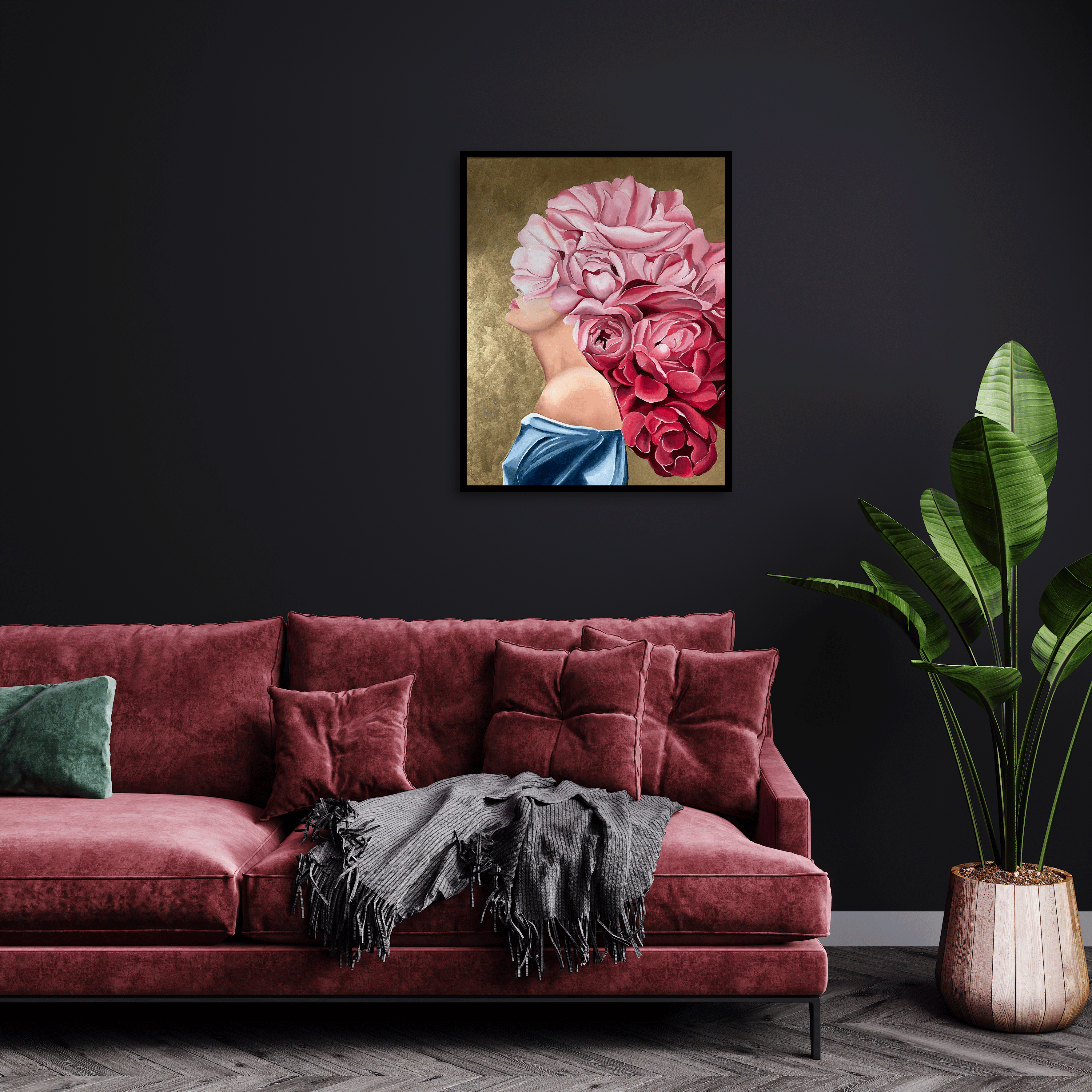 Un visage voilé par des fleurs aux nuances de rose, symbolisant la féminité, la sensibilité et la liberté intérieure. Le fond doré apporte chaleur et élégance, faisant de cette toile une présence délicate et expressive dans tout espace. Oeuvre inspiré d'une murale.