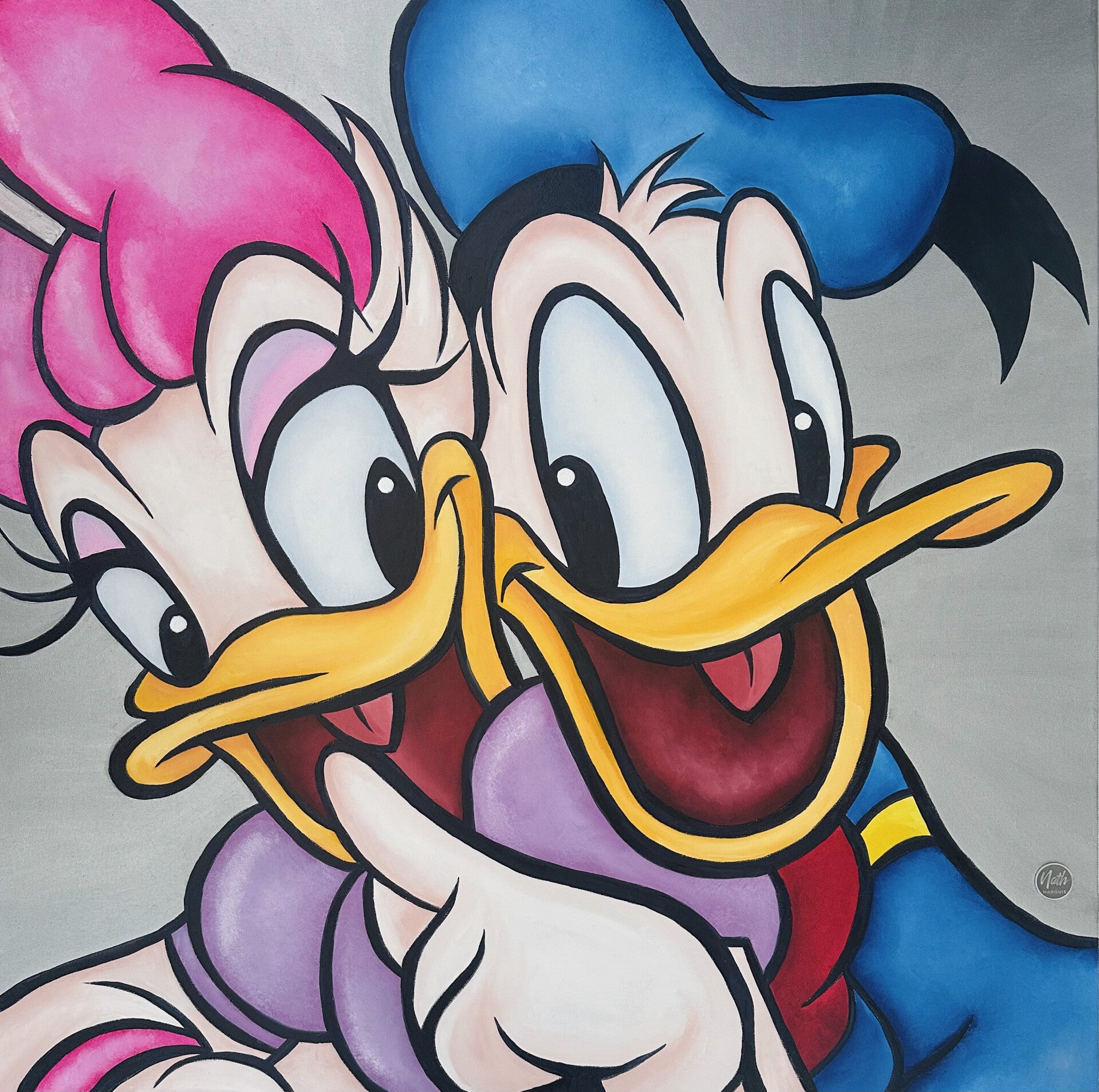 Cette toile capture un moment de joie complice et d’espièglerie, mettant en scène deux personnages emblématiques.Les couleurs vives, les lignes marquées et les expressions exagérées transmettent une énergie ludique et positive.