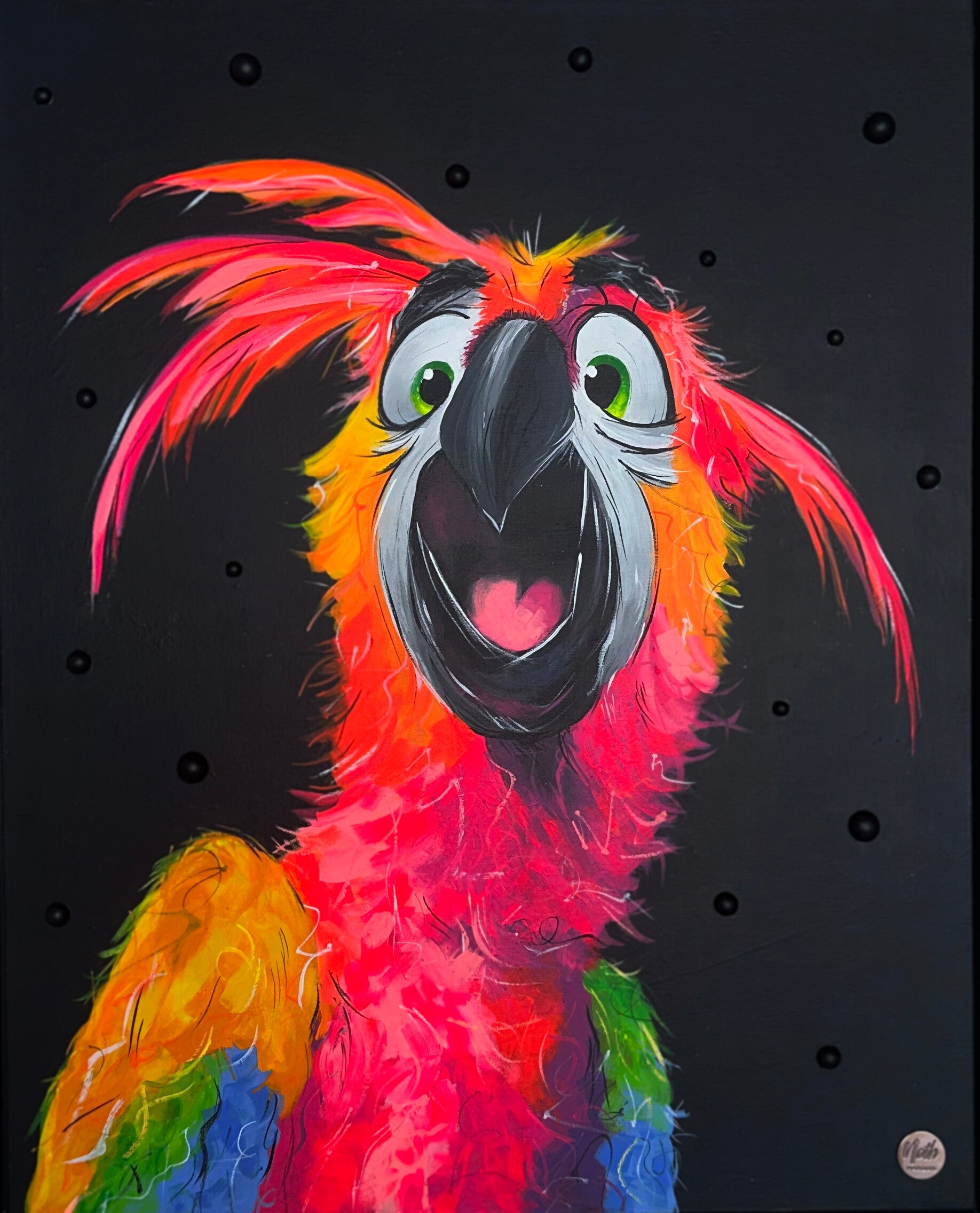 Explosion de couleurs et d’énergie, cette toile met en scène un perroquet expressif au caractère joyeux et audacieux. Son regard pétillant et son attitude ludique insufflent du mouvement et de la vie à l’œuvre. Les teintes vibrantes contrastent avec le fond sombre, créant une présence forte et résolument contemporaine. Une pièce artistique et dynamique, idéale pour apporter une touche de joie et de caractère à n’importe quel espace. Oeuvre inspiré d'un visuel.